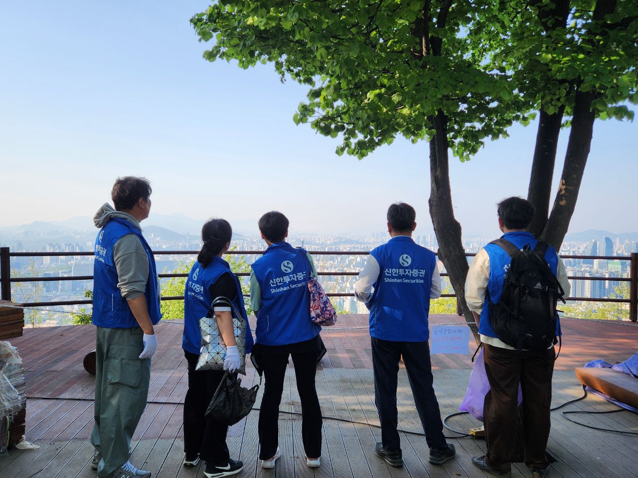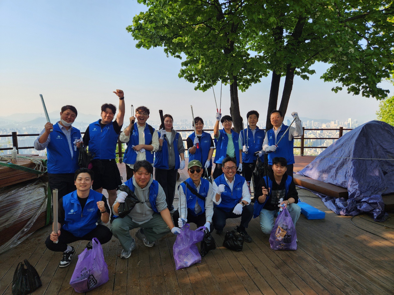 약 1시간 동안 이어진 활동은 정상 '소망탑'에서 다함께 모여 수거한 쓰레기를 확인하고 쉼을 갖는 시간이 되었는데요.