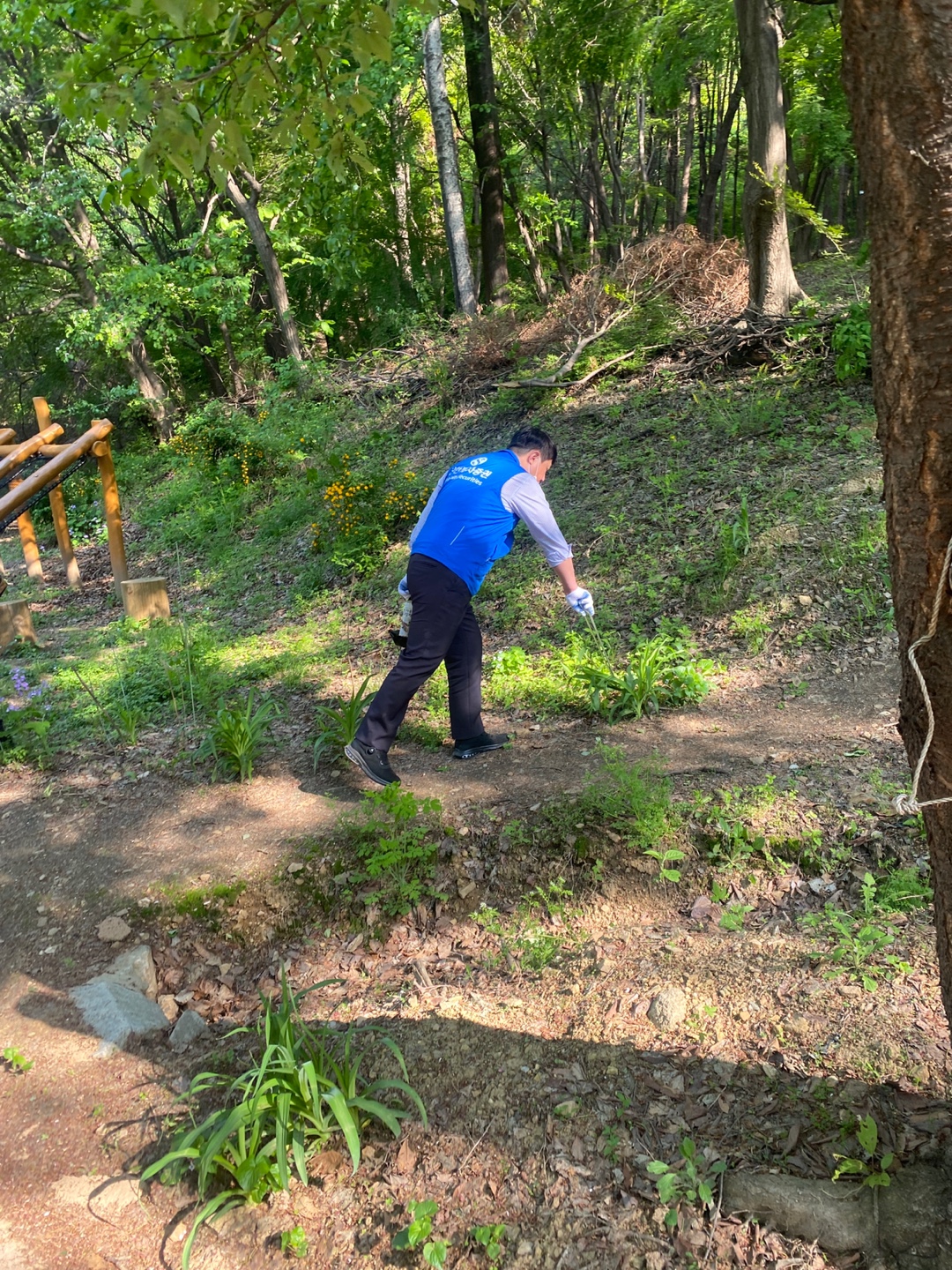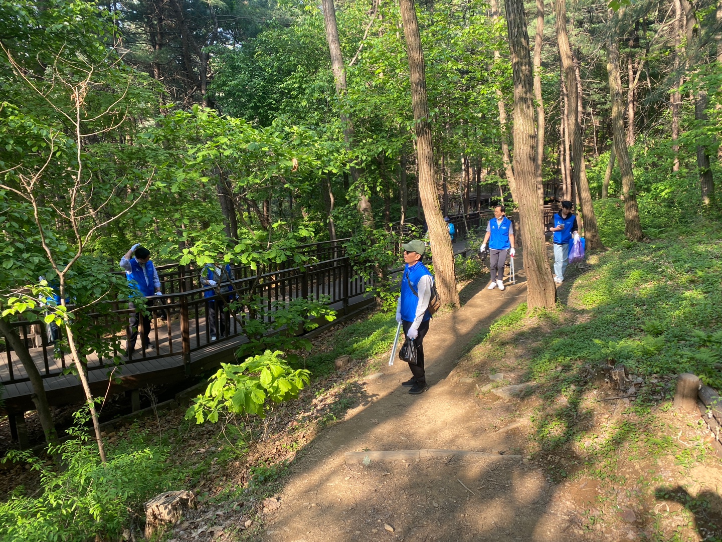 둘레길 코스에서 정상으로 올라가는 길엔 비포장된 경사로가 있었지만, 임직원들의 적극적인 활동 참여가 이루어졌습니다.