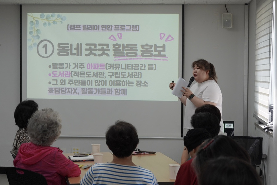 연합 자원봉사 활동에 대해 활동가 거주 아파트(커뮤니티 공간 등), 도서관(작은도서관, 구립도서관), 그 외 주민들이 많이 이용하는 장소에 담당자가 아닌 활동가들과 함께 홍보합니다.