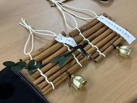 7번째 시나몬을 마져 묶고 양쪽 끈의 길이를 똑같이 맞춘 후, 아래쪽에는 종을 달아 완성도를 높였습니다.