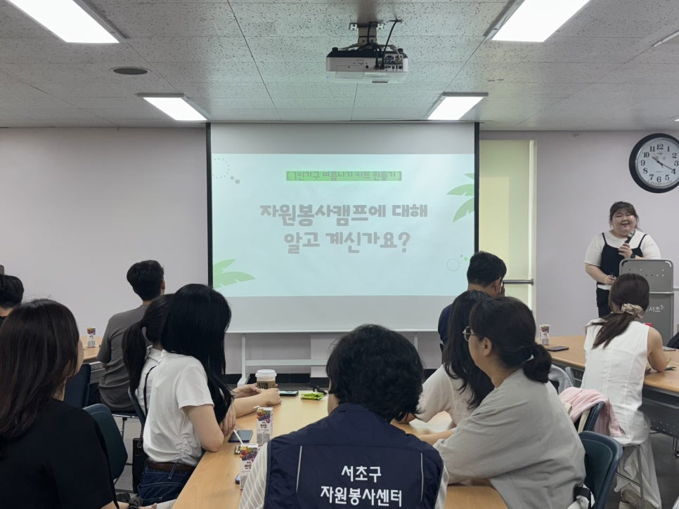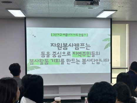 반면에 '자원봉사캠프'는 동을 중심으로 지역주민들에게 봉사활동 기회를 만들어주는 봉사단입니다.