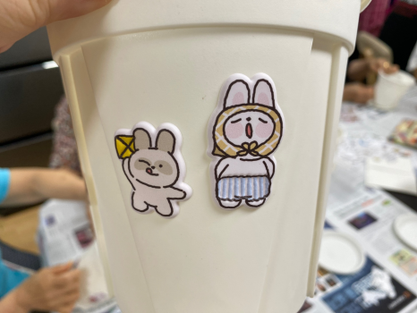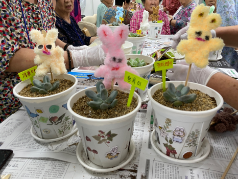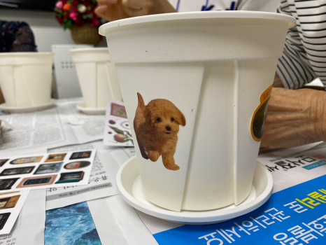 스티커를 배부 받고 어르신들이 좋아하는 동물, 식물,귀여운 이모티콘 등을 화분에 꾸미기 시작했어요~!
