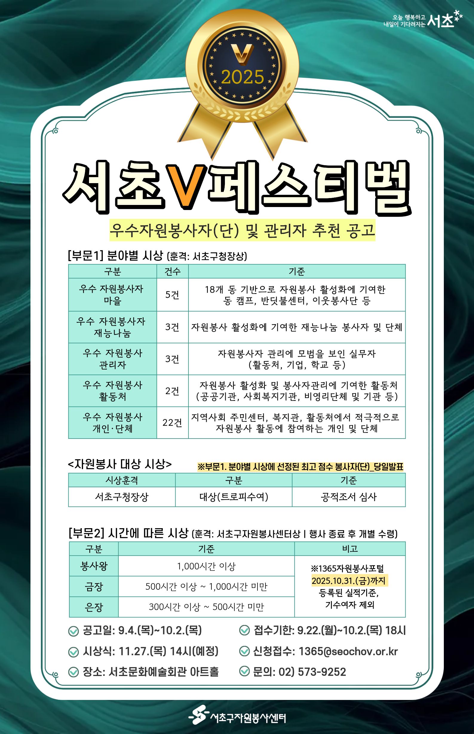 우리 센터에서는 자원봉사자들의 공로를 인정하고 활동을 축하하는 자원봉사자 연말대회인 <2025 서초V페스티벌>을 맞아, 자원봉사활동에 있어서 모범을 보인 자원봉사자(개인 및 단체) 및 자원봉사관리에 있어서 우수한 업무를 수행한 자원봉사관리자들을 격려하고 인정하는 시상을 마련하고자 합니다.