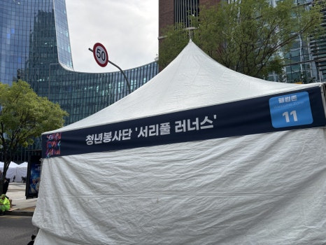 핫핑크 티셔츠를 입은 러너스들은 여전히 환한 미소로 시민들을 맞이하고 있었어요.