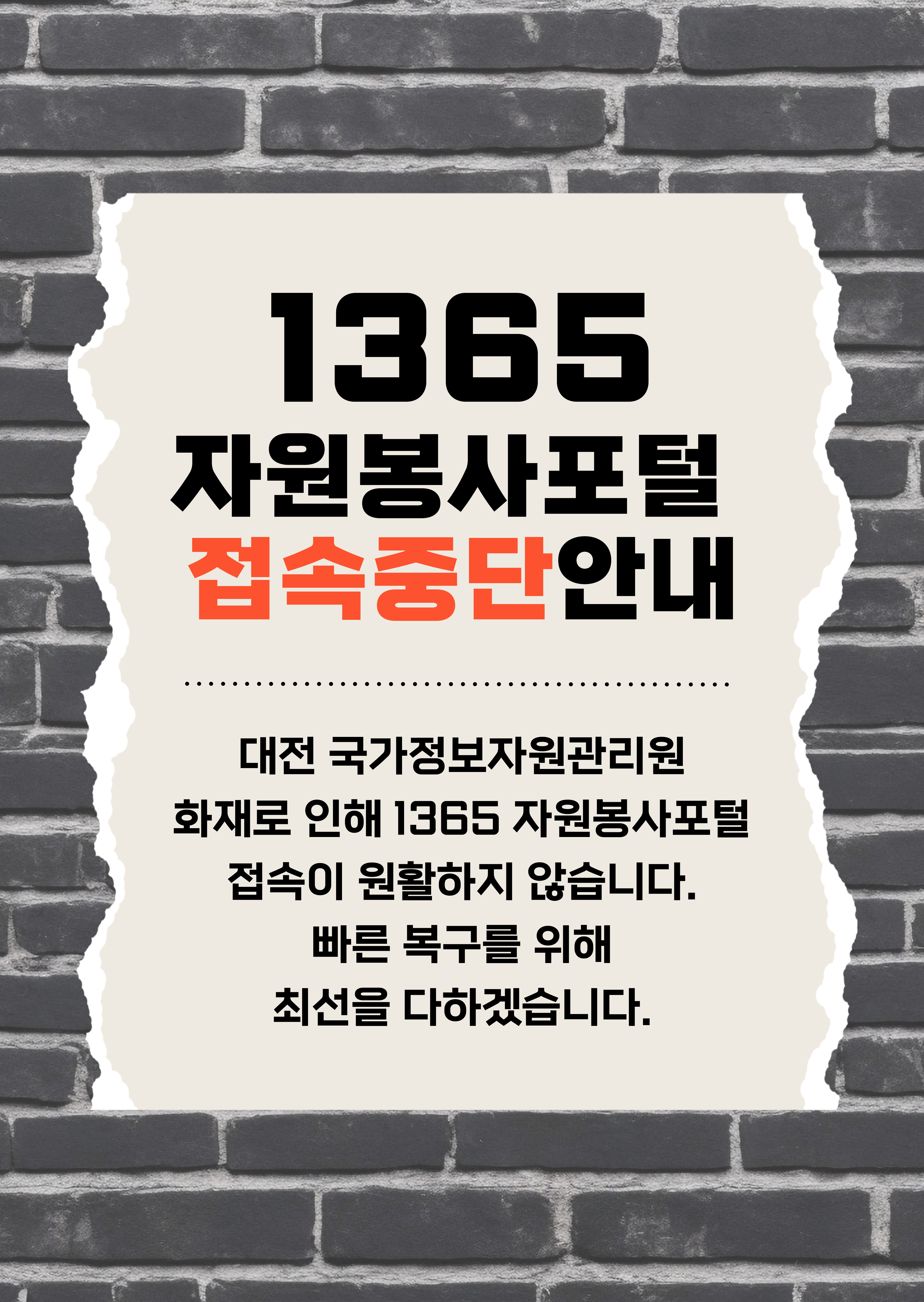 안녕하세요. 서초구자원봉사센터입니다. 지난 26일 발생한 대전 국가정보자원관리원 화재로 인해 현재 1365자원봉사포털 접속이 원활하지 않은 상황입니다. 이에 따라 아래와 같이 안내드립니다.