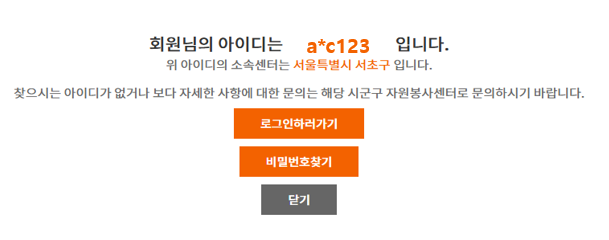 셋째, 본인인증 완료 후 나타나는 아이디를 확인하여 주세요. 마스킹된 부분까지 확인하시려면 서초구자원봉사센터(02-573-9252)로 연락주시면 확인을 도와드릴 수 있습니다.
